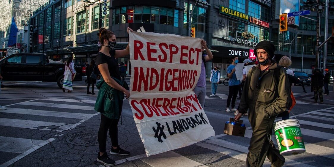 First Nations activists and allies blocked the intersection of Yonge and Dundas Street in Toronto ... [+] calling on the Canadian government to uphold treaty rights, respect indigenous sovereignty...
